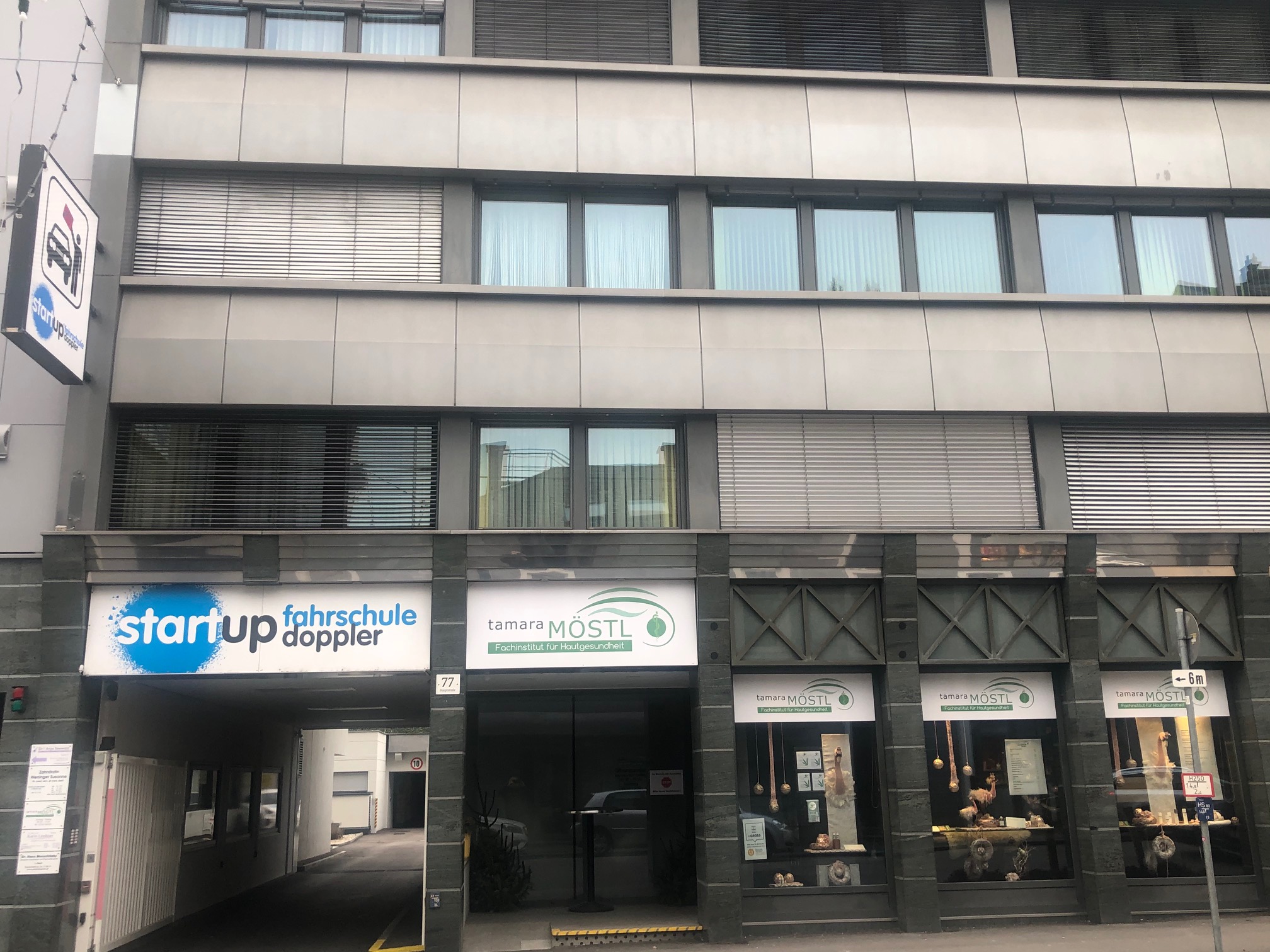 Über dem Hauseingang ist ein Schild der Startup-Fahrschule Doppler angebracht, die sich im Hinterhof befindet.